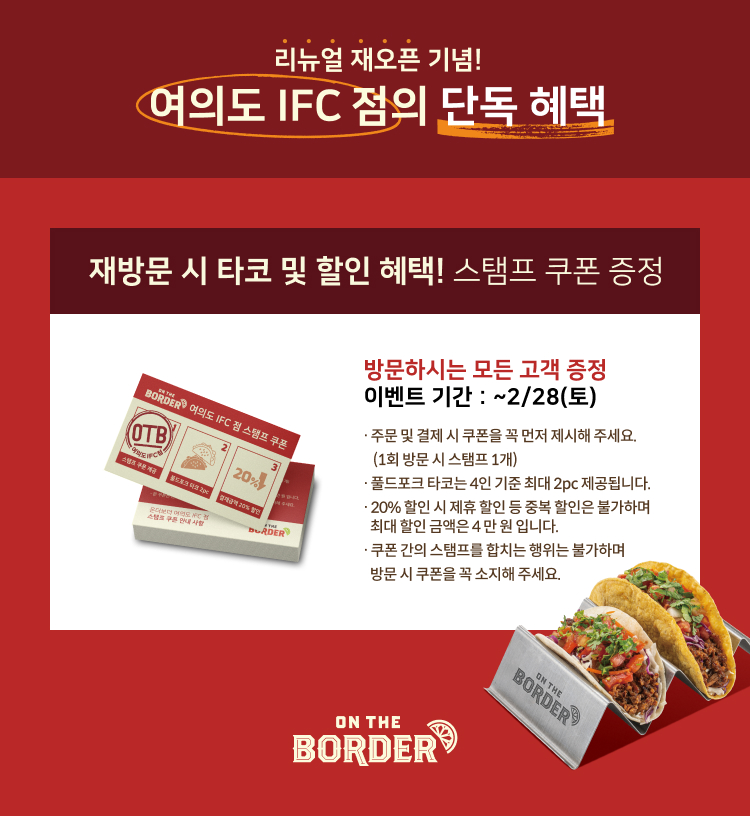 신선한 재료와 홈메이드 방식을 추구하는 정통 멕시칸 레스토랑 온더보더가 IFC Mall에 리뉴얼 오픈 하였습니다.